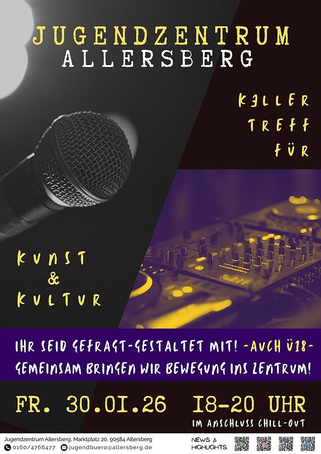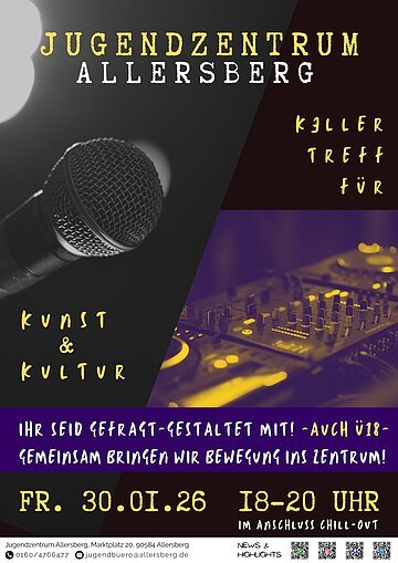 Am Freitag, 30.01.2026 von 18–20 Uhr laden wir euch ein, Eure Ideen für mögliche Veranstaltungen & Projekte im Bereich Kunst & Kultur, im neuen Jugendzentrum einzubringen.