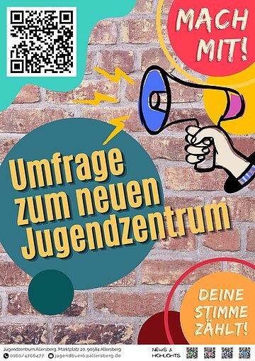 Unser Jugendzentrum ist eröffnet – und jetzt geht’s darum, es gemeinsam zu einem Ort zu machen, der wirklich zu euch passt. In einer kurzen Online-Befragung könnt ihr eure Wünsche zu Aktionen, Angeboten, Öffnungszeiten, Kunst, Kultur und sogar zum zukünftigen Namen des Jugendzentrums teilen.