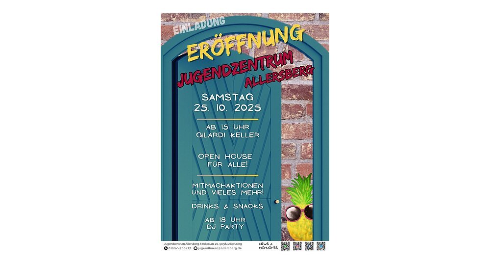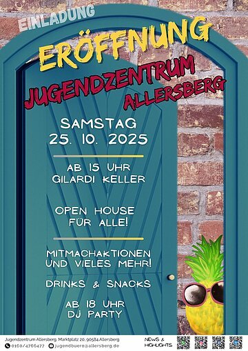 Am Samstag, 25. Oktober 2025 ab 15:00 Uhr öffnen sich die Türen des neuen Jugendzentrums Allersberg – und wir laden Euch ALLE herzlich dazu ein!