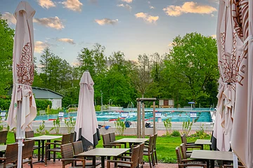 Eine Stärkung gibt’s am Kiosk mit Pommes, Curry-Wurst, Eis oder italienischen Speisen sowie heißen und kalten Getränken. Von der großen Sonnenterrasse aus genießen Gäste den Blick auf die Becken und den Sprungturm.